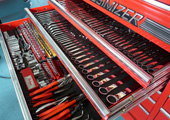 自社工場内にはリフト3基が存在。驚くほどキレイに整理整頓された工具類(E型レンチも多数存在)からも、Garage ENZOの企業理念や整備にかける姿勢を窺い知れた。